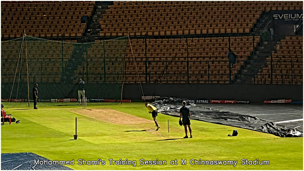 Following a tough day on the field against New Zealand, Mohammed Shami was seen training at M Chinnaswamy Stadium. He commenced his session with gentle warm-up jogs and progressively intensified his bowling, even though he had a strap on his left knee to manage swelling. Under the supervision of Troy Cooley and Nitin Patel, Shami gradually approached bowling at almost full pace, signaling that he is on the mend from his knee injury.